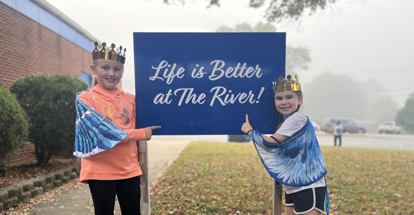 Two girls in capes and crowns smiling by a sign that reads 'Life is Better at The River!'.